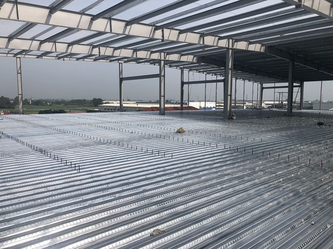 Đầu tiên, các tấm sàn deck được đặt đúng vị trí trên hệ dầm thép và liên kết với hệ dầm thép hình bằng đinh chống cắt. Các đinh này được thi công bằng máy bắn đinh hàn chuyên dụng. Tiếp theo, đơn vị thi công trải 1 lớp lưới thép hàn khoảng cách từ 150mm - 200mm và đổ bê tông lên bản sàn.